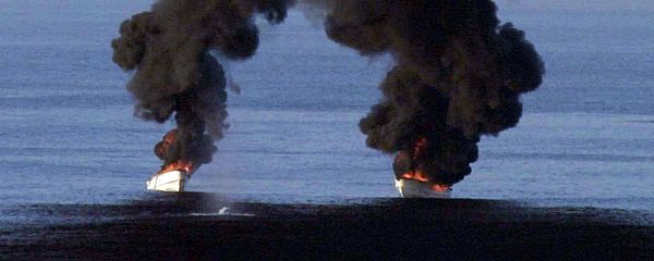 US NAVY: Suspected pirate skiffs burn from weapons fire from the guided-missile destroyer USS Momsen (Feb. 2011)
